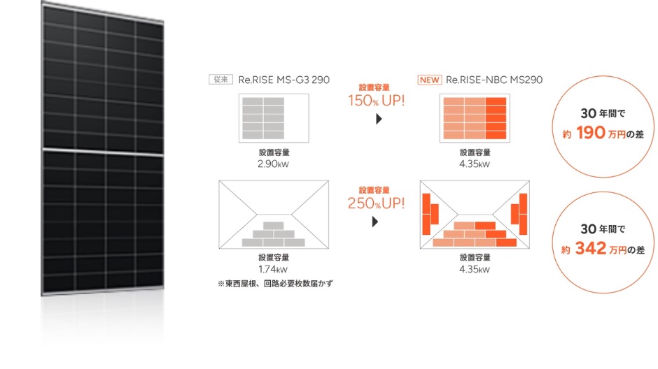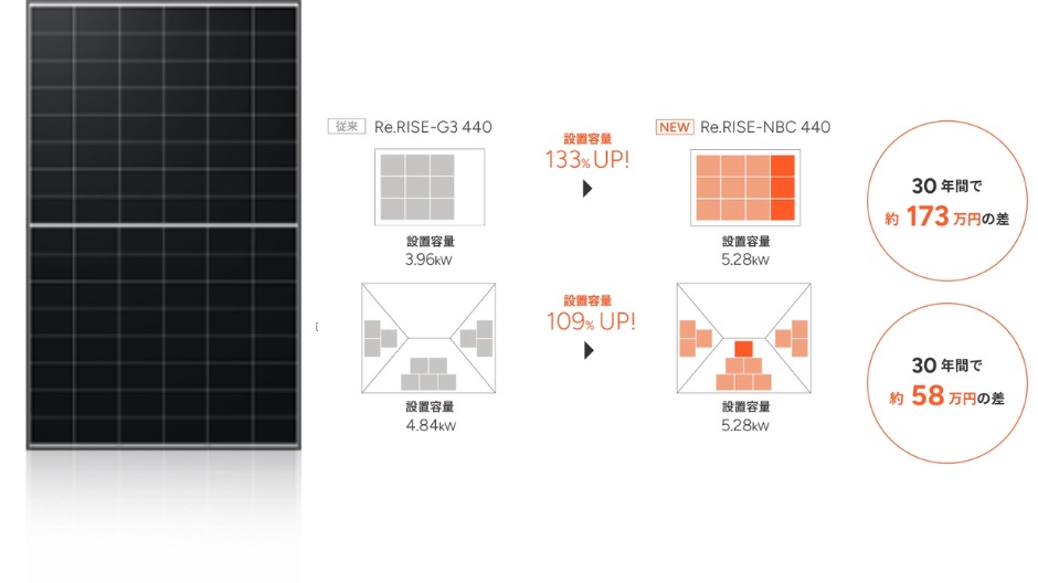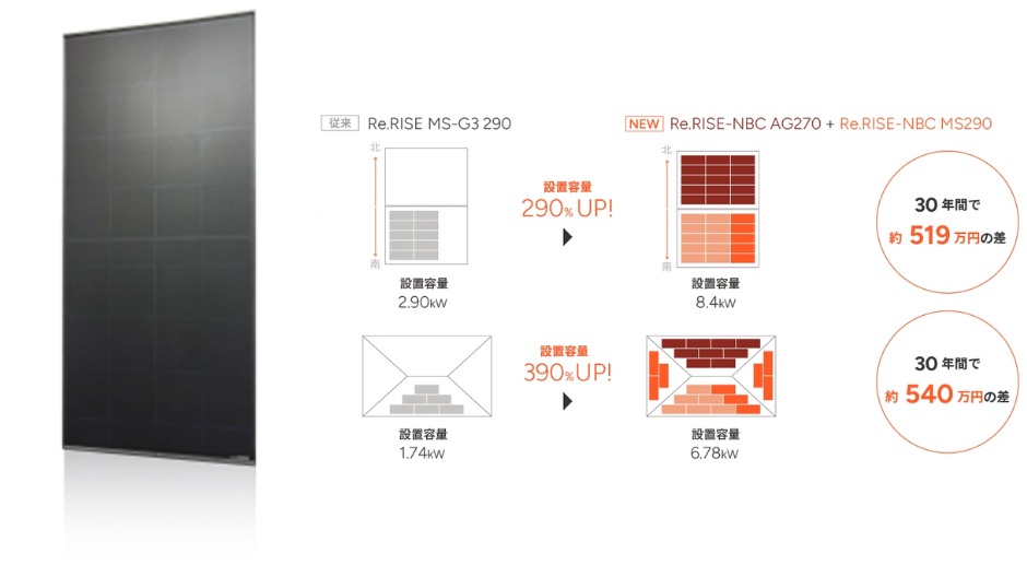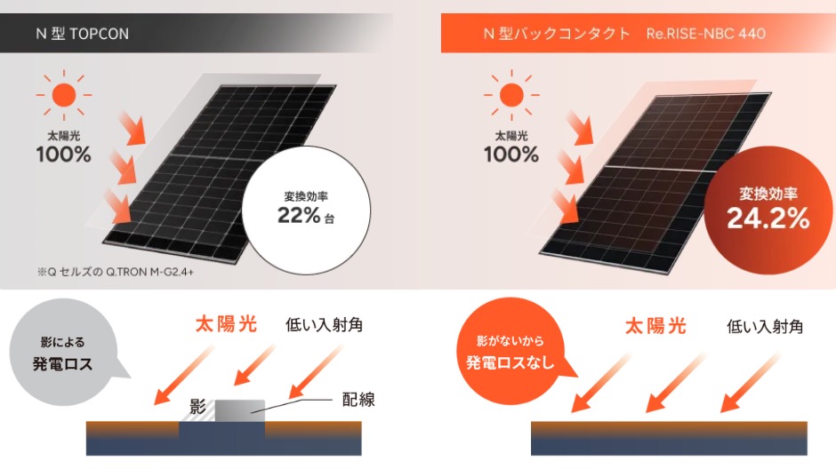 特にRe.RISE-NBCシリーズではN型セルとバックコンタクト技術を適用して変換効率最大24.2%を実現。